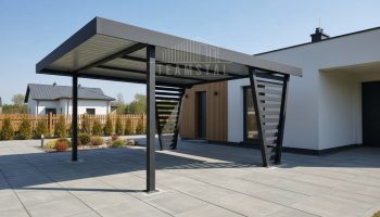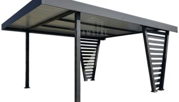 • Szerokość: 4m • Długość: 5m • Szerokość wjazdu: 380 cm • Szerokość zewnętrzna: 408 cm (wymiar wraz ze stopą słupa) • Słupy przód: 2 sztuk  z profila zamkniętego stalowego 100×100 mm, na solidnych stopach 180×180 mm (cofnięte 80 cm od przodu) • Słupy z tyłu konstrukcji w kształcie V wypełnione profilami poziomymi (cofnięte o 50 cm od tyłu) • Dach: Blacha trapezowa T18 plus o grubości 0,6-0,7 mm Ciemny grafit antracyt RAL7016 • 4 belki stalowe pod dachem z profilu 800×40 mm • Obróbka blacharska dachu: szerokość 200mm, mocowana na blachę za pomocą nitów szczelnych, dopasowanych kolorystycznie do koloru blachy • Konstrukcja skręcana śrubami M16 • Wysokość całkowita z przodu: 238cm • Wysokość całkowita z tyłu: 218cm • Wysokość światła wjazdu: 218cm • Spad dachu: na tył • Cała konstrukcja carportu malowana metodą proszkową