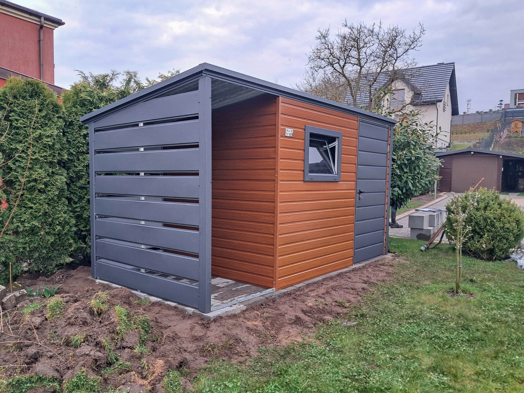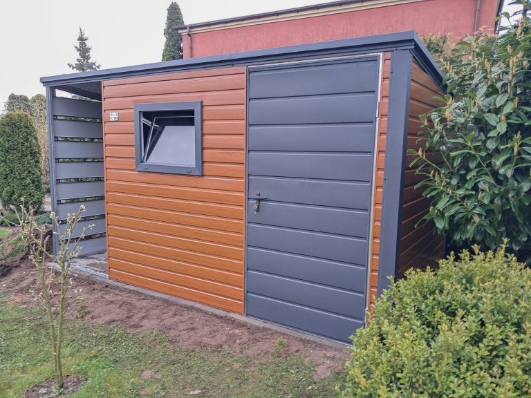Schowek – domek ogrodowy 2,5x2m + wiata 0,5m – drzwi – okno – złoty dąb – drewnopodobny – dach spad w tył TS1079