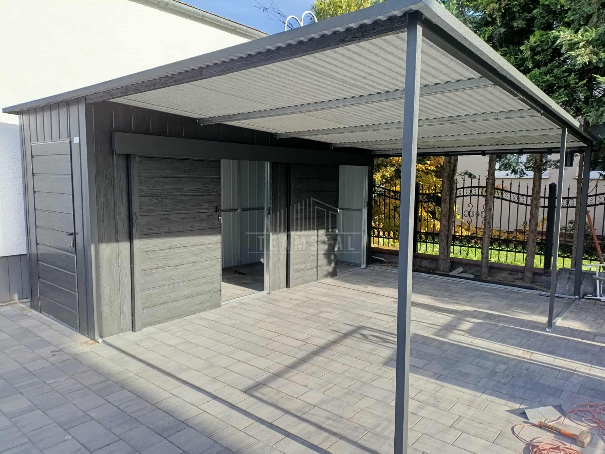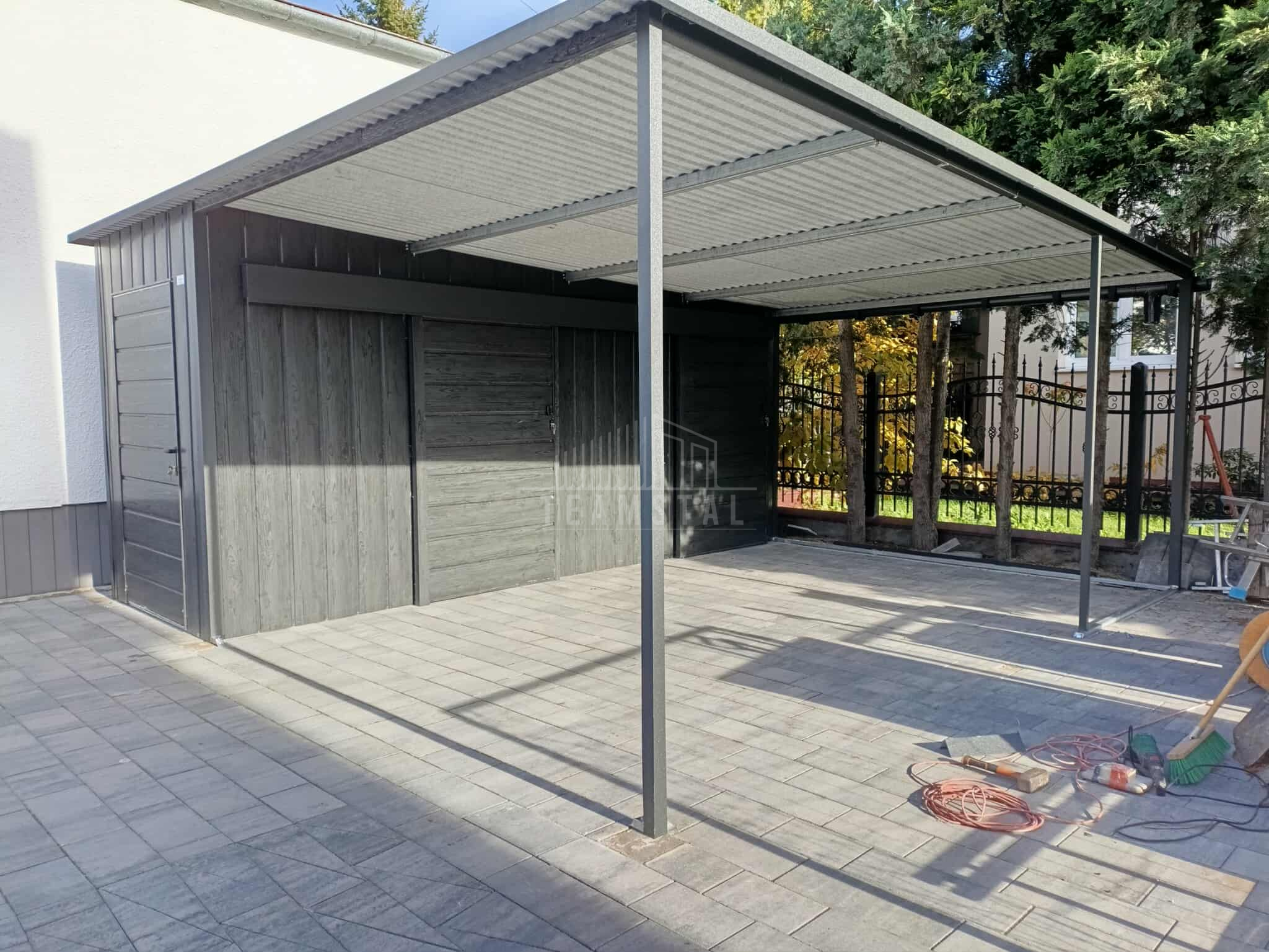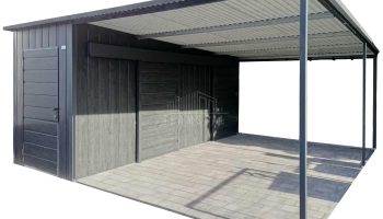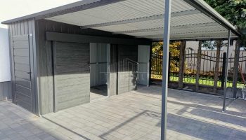 • szerokość : 1,7 m • długość : 5 m • wiata : 3,3×5 m • dach : spad w tył kolor : antracyt mat 7016 • drzwi 100x200cm przetłoczenie poziom T17 kolor: sosna norweska • 2 x drzwi przesuwne szer. 100 cm przetłoczenie poziom T17 kolor: sosna norweska • przetłoczenie ścian T17 pion kolor : sosna norweska • wysokość ścian z przodu : 233 cm • wysokość ścian z tyłu : 210 cm • Konstrukcja – profil zamknięty ocynk • Zamek + Klucze • nity + wkręty w kolorze garażu • obróbki ścian • obróbki dachu • rynna + spust Każdy produkt można dowolnie modyfikować aby dostosować do swoich indywidualnych potrzeb. Możliwa edycja :