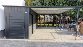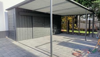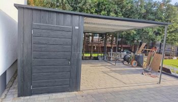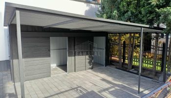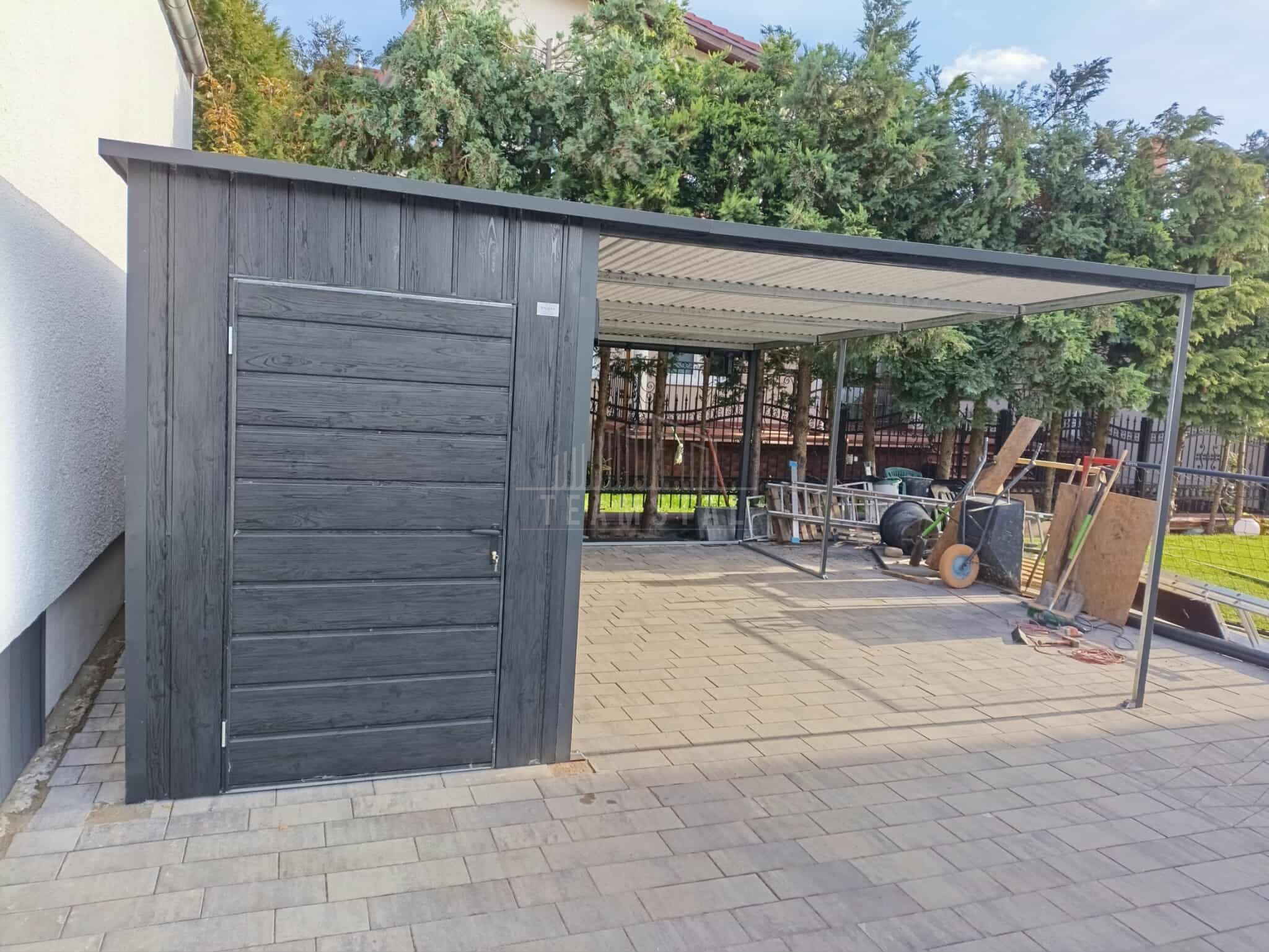 Schowek – domek ogrodowy 1,7×5 + wiata 3,3m – 2x drzwi przesuwne – drzwi standard – sosna norweska – drewnopodobne – spad w tył TS1241
