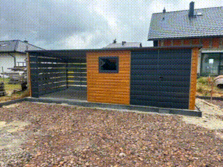 • szerokość : 3,8m • długość : 2,5m • wiata : 3,0×2,5 m zabudowana boczna , tylna i 0,5m przedniej ściany panelami kolor: antracyt BTX 7016 • dach : spad w tył kolor : antracyt BTX 7016 • brama dwuskrzydłowa 200 x 200 cm przetłoczenie poziom T17 kolor : antracyt BTX 7016 • drzwi 90 cm przetłoczenie T17 kolor : antracyt BTX 7016 • okno uchylne PCV 80x60cm • Przetłoczenie ścian T7 poziom kolor : jasny orzech • wysokość ścian z przodu : 214 cm • wysokość ścian z tyłu : 190 cm • Konstrukcja – profil zamknięty ocynk • Zamek + Klucze • nity + wkręty w kolorze garażu • obróbki ścian i dachu MOŻLIWA EDYCJA PROJEKTU (WYMIARÓW, KOLORU, MATERIAŁU ORAZ INNYCH ELEMENTÓW) PRZY WCZEŚNIEJSZY KONTAKCIE  Opcje dodatkowe: