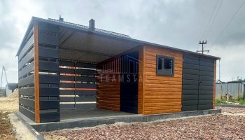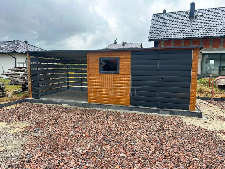• szerokość : 3,8m • długość : 2,5m • wiata : 3,0×2,5 m zabudowana boczna , tylna i 0,5m przedniej ściany panelami kolor: antracyt BTX 7016 • dach : spad w tył kolor : antracyt BTX 7016 • brama dwuskrzydłowa 200 x 200 cm przetłoczenie poziom T17 kolor : antracyt BTX 7016 • drzwi 90 cm przetłoczenie T17 kolor : antracyt BTX 7016 • okno uchylne PCV 80x60cm • Przetłoczenie ścian T7 poziom kolor : jasny orzech • wysokość ścian z przodu : 214 cm • wysokość ścian z tyłu : 190 cm • Konstrukcja – profil zamknięty ocynk • Zamek + Klucze • nity + wkręty w kolorze garażu • obróbki ścian i dachu MOŻLIWA EDYCJA PROJEKTU (WYMIARÓW, KOLORU, MATERIAŁU ORAZ INNYCH ELEMENTÓW) PRZY WCZEŚNIEJSZY KONTAKCIE  Opcje dodatkowe: