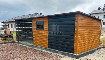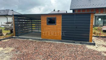 Schowek – domek ogrodowy 3,8×2,5m – wiata 3m – drzwi – okno – jasny orzech – drewnopodobny – czarny – dach spad w tył TS1128