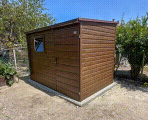 Schowek – domek ogrodowy 3x2m – drzwi – okno – ciemny orzech – dach spad w przód – rynna TS1129