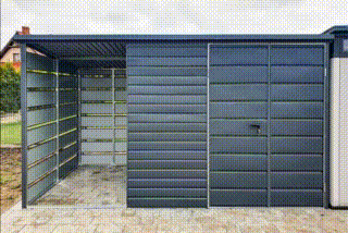 Schowek – Domek Ogrodowy 3x2m + wiata 1,5x2m – Brama dwuskrzydłowa – Antracyt – Ciemny Orzech – Drewnopodobny – Dach spad w tył TS718
