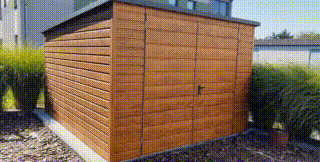 Schowek – Domek Ogrodowy 3x3m – Brama dwuskrzydłowa – Jasny Orzech – Drewnopodobny – dach spad w tył TS839