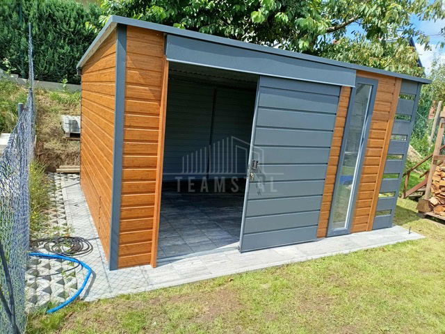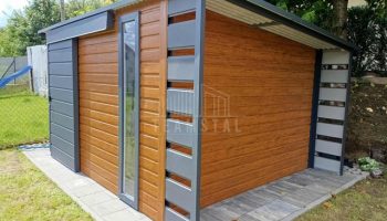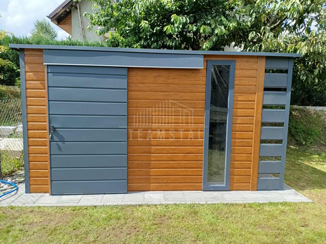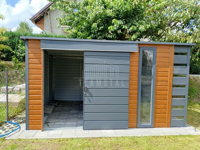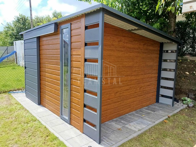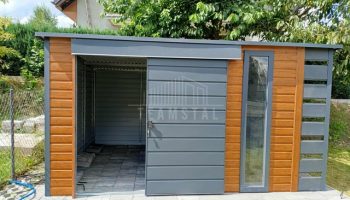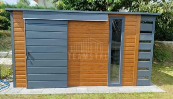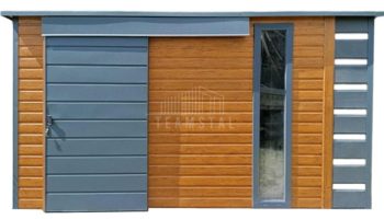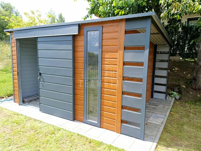 Schowek – domek ogrodowy 4,5×2,5m – wiata 0,5m – drzwi przesuwne – okno – jasny orzech – drewnopodobny – dach spad w tył TS1168