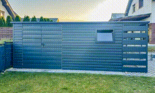 Schowek – Domek Ogrodowy 4,5x2m + Wiata 1m – Brama Dwuskrzydłowa – Okno – Antracyt – Dach spad w tył TS702