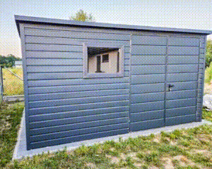 / Schowek – domek ogrodowy 4x3m brama dwuskrzydłowa – 2x okno – antracyt – rynny – dach spad w tył TS759