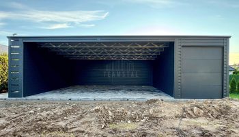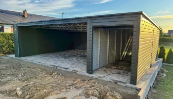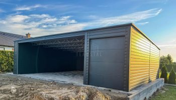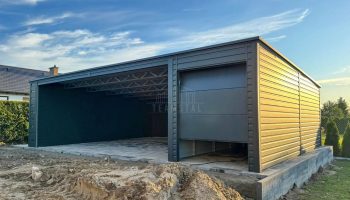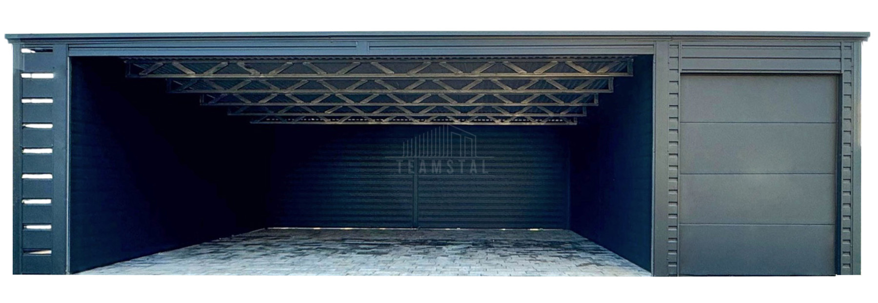 Wiata samochodowa 6x6m – Garaż blaszany 2,5x6m – wiata 0,5m – brama segmentowa – wzmocnienie pod fotowoltaikę – antracyt – dach spad w tył TS1206