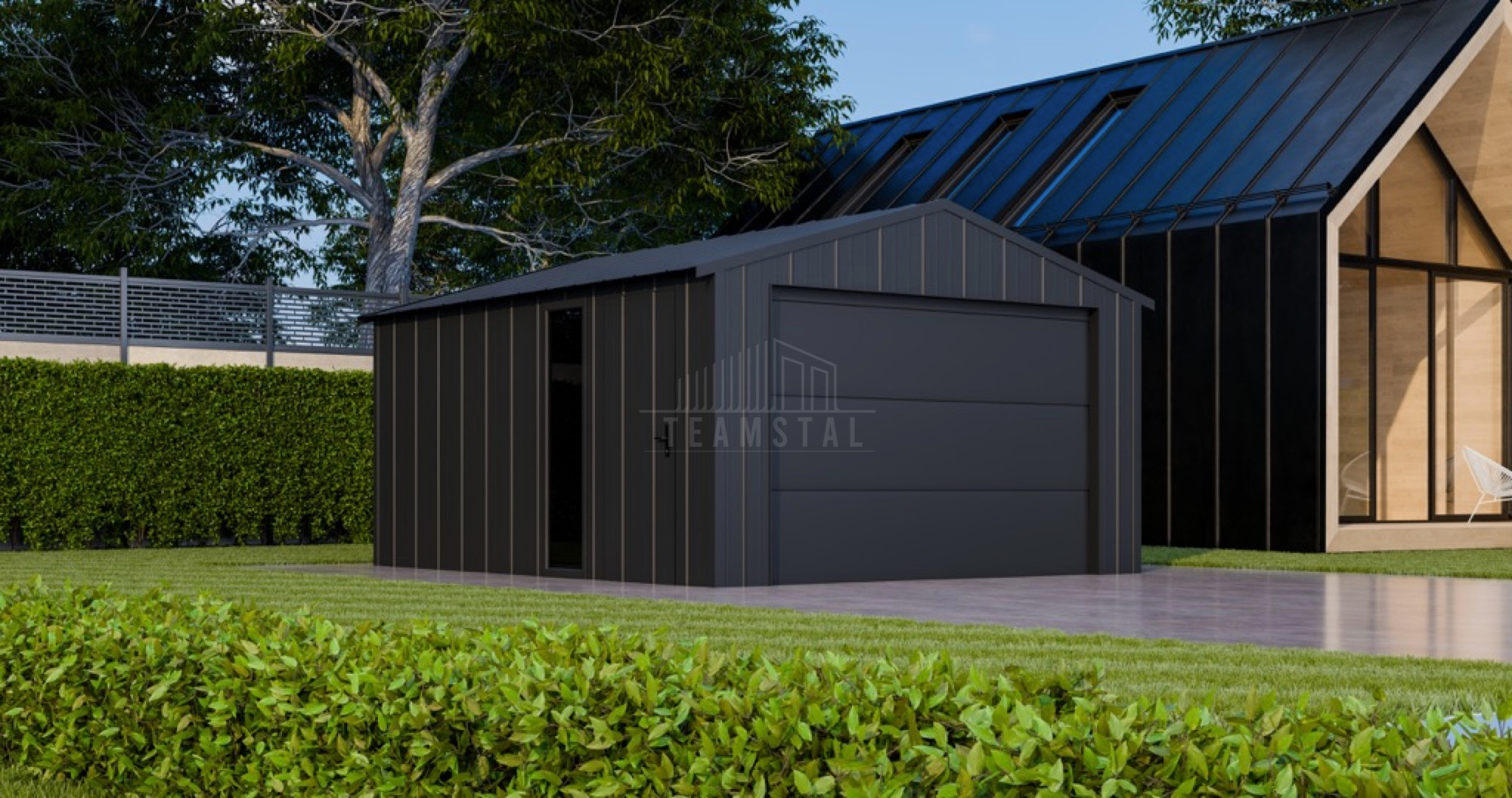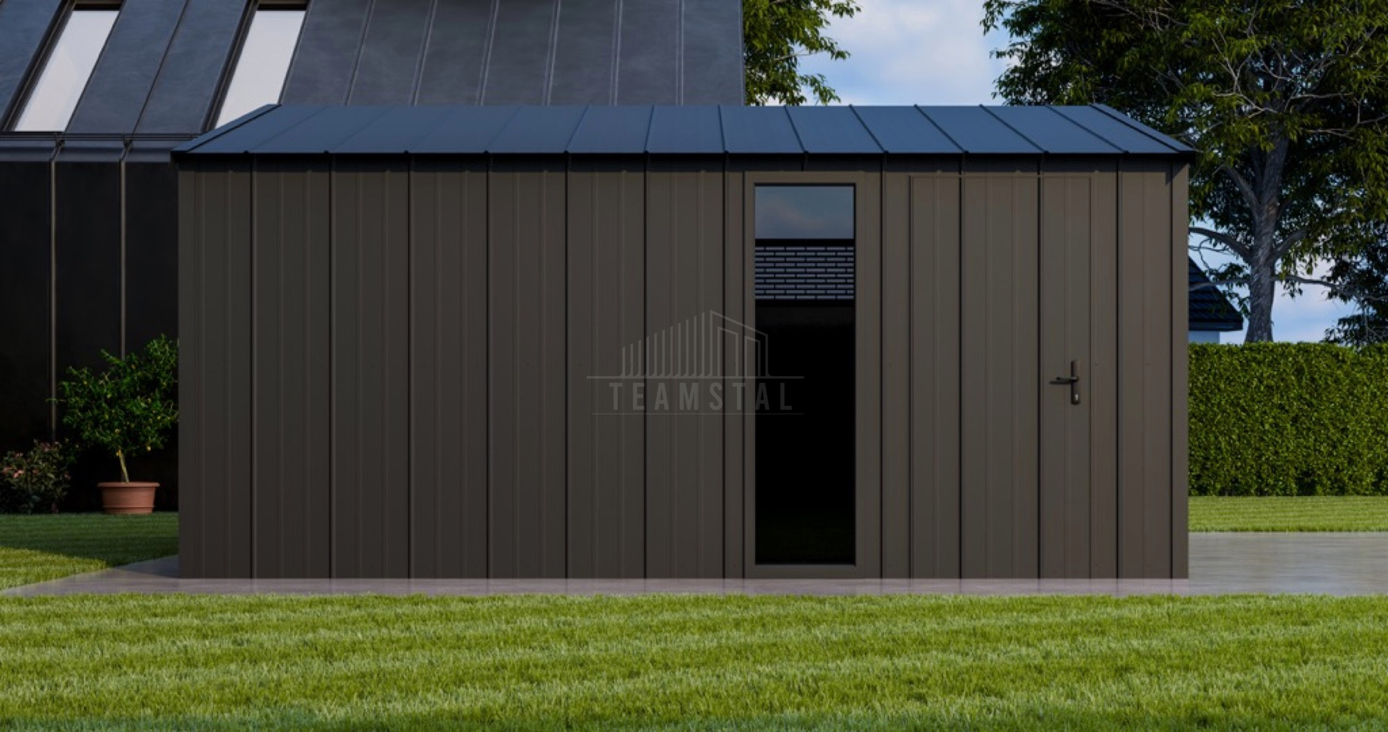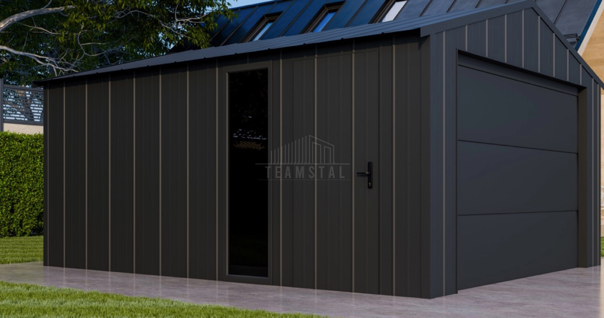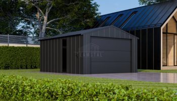 • dach: dwuspadowy, pokryty blachą na rąbek, kolor: antracyt mat 7016