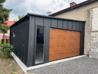 Garaż Blaszany 5×5,5 m – brama segmentowa – 2x okno – drzwi – blacha na rąbek – rynny TS1164