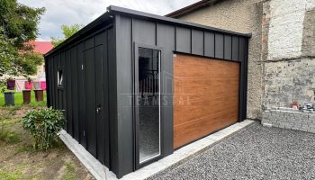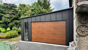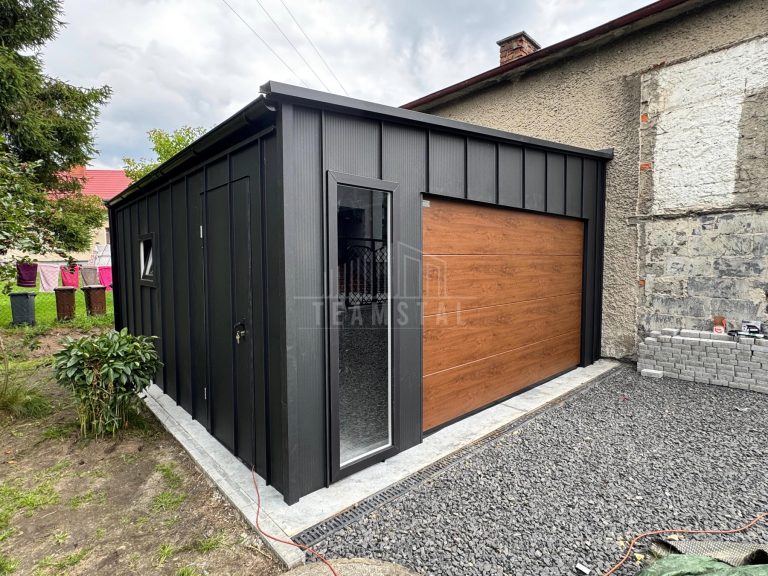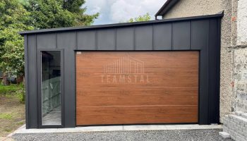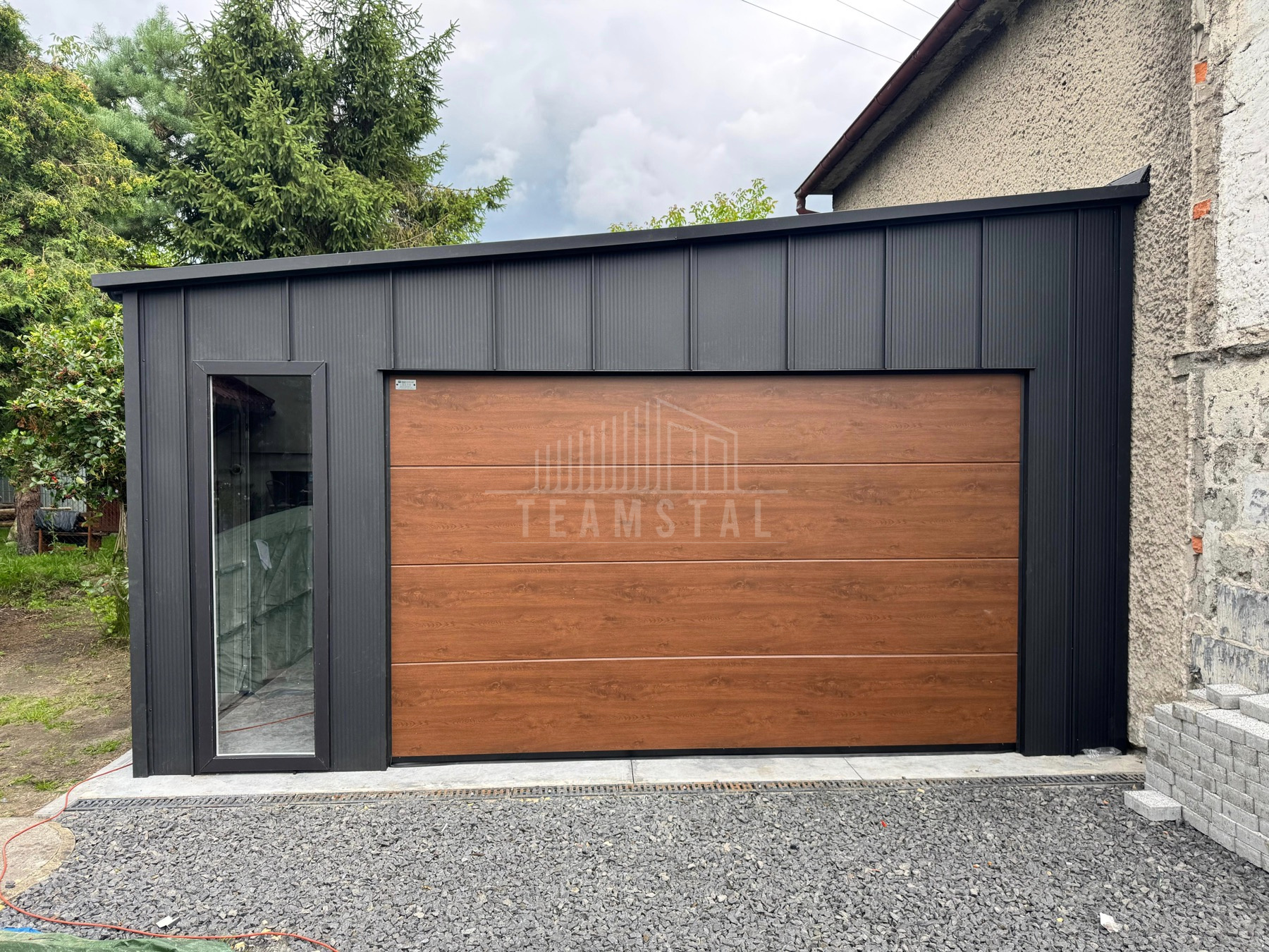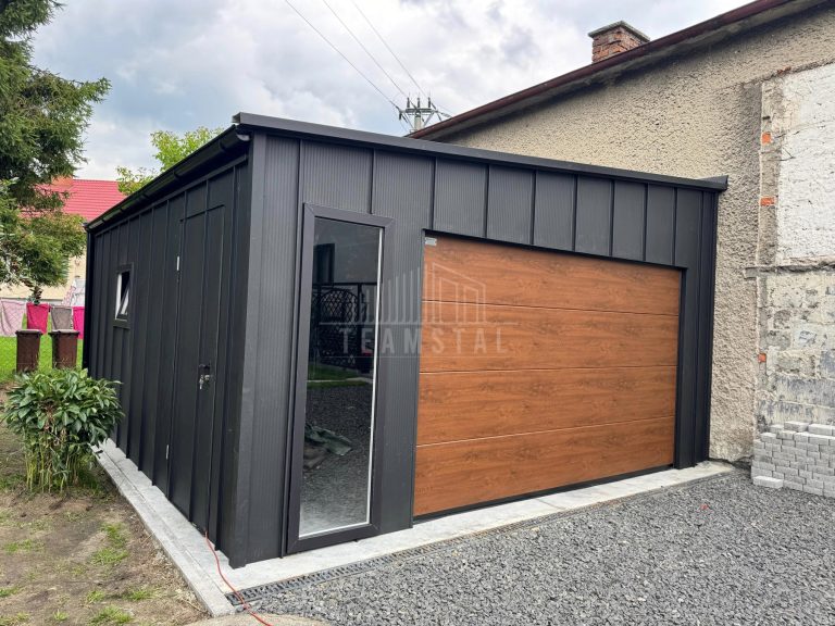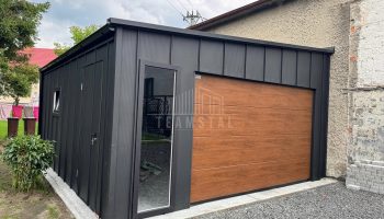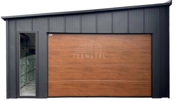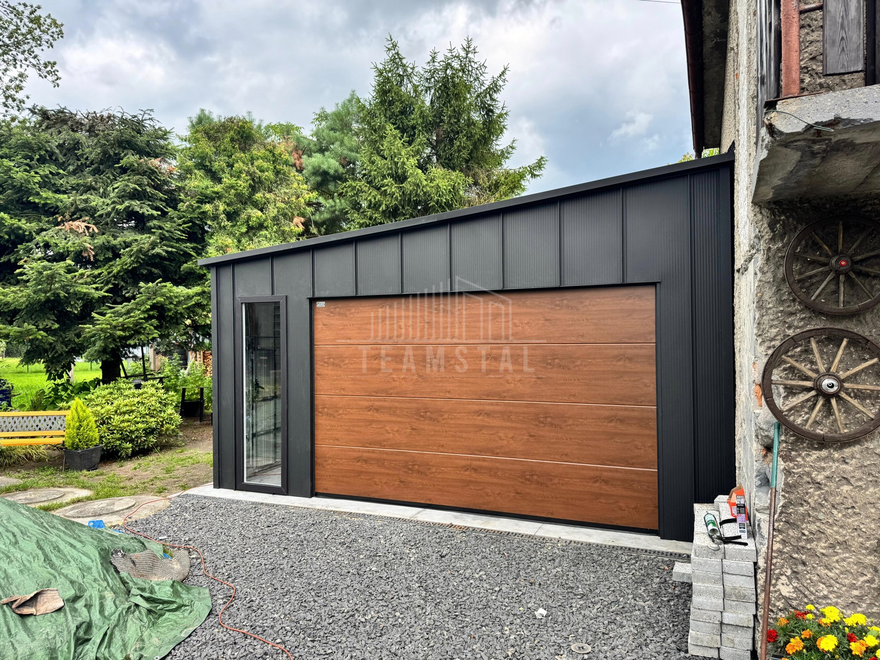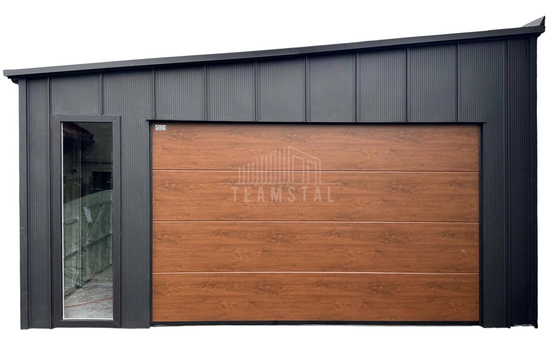 Garaż Blaszany 5×5,5 m – brama segmentowa – 2x okno – drzwi – blacha na rąbek – rynny TS1164