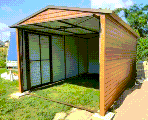 GARAŻ BLASZANY 3m x 4m poziom – dwuspad Brama + drzwi jasny orzech TS227 3×4