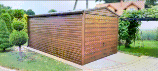 GARAŻ BLASZANY 3m x 6m poziom – dwuspad – Brama uchylna – ciemny orzech rynny TS268 3×6