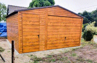 GARAŻ BLASZANY 4,5m x 5m poziom – dwuspad Brama uchylna + drzwi – jasny orzech TS215 4,5×5