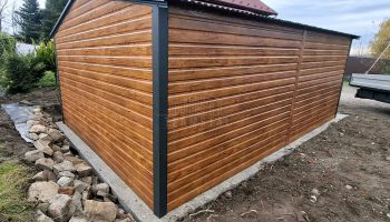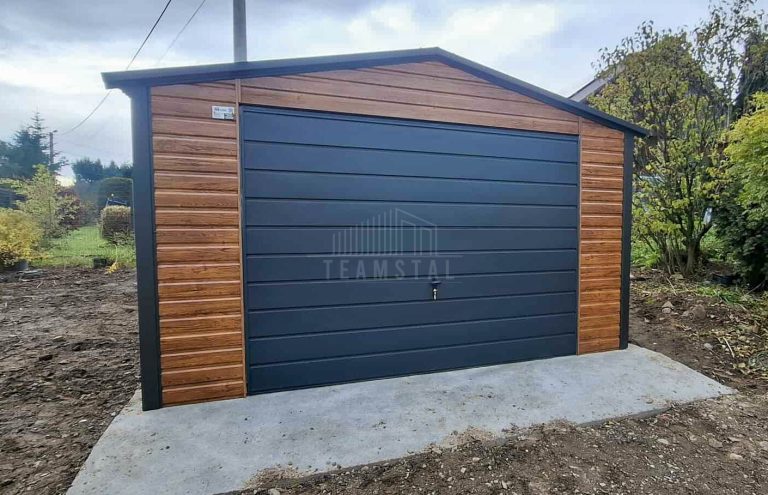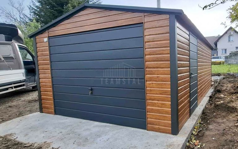 Garaż blaszany 4,5×6 m – brama uchylna – drzwi – jasny orzech – drewnopodobny – dach dwuspadowy TS1235
