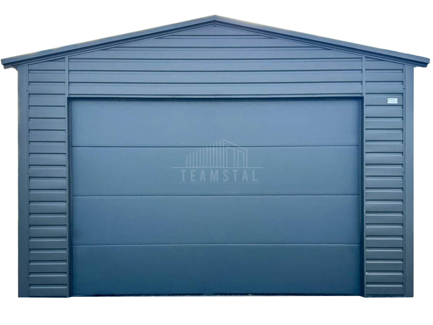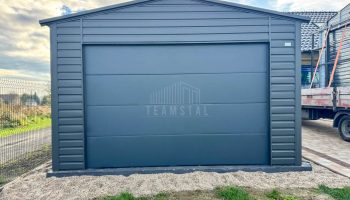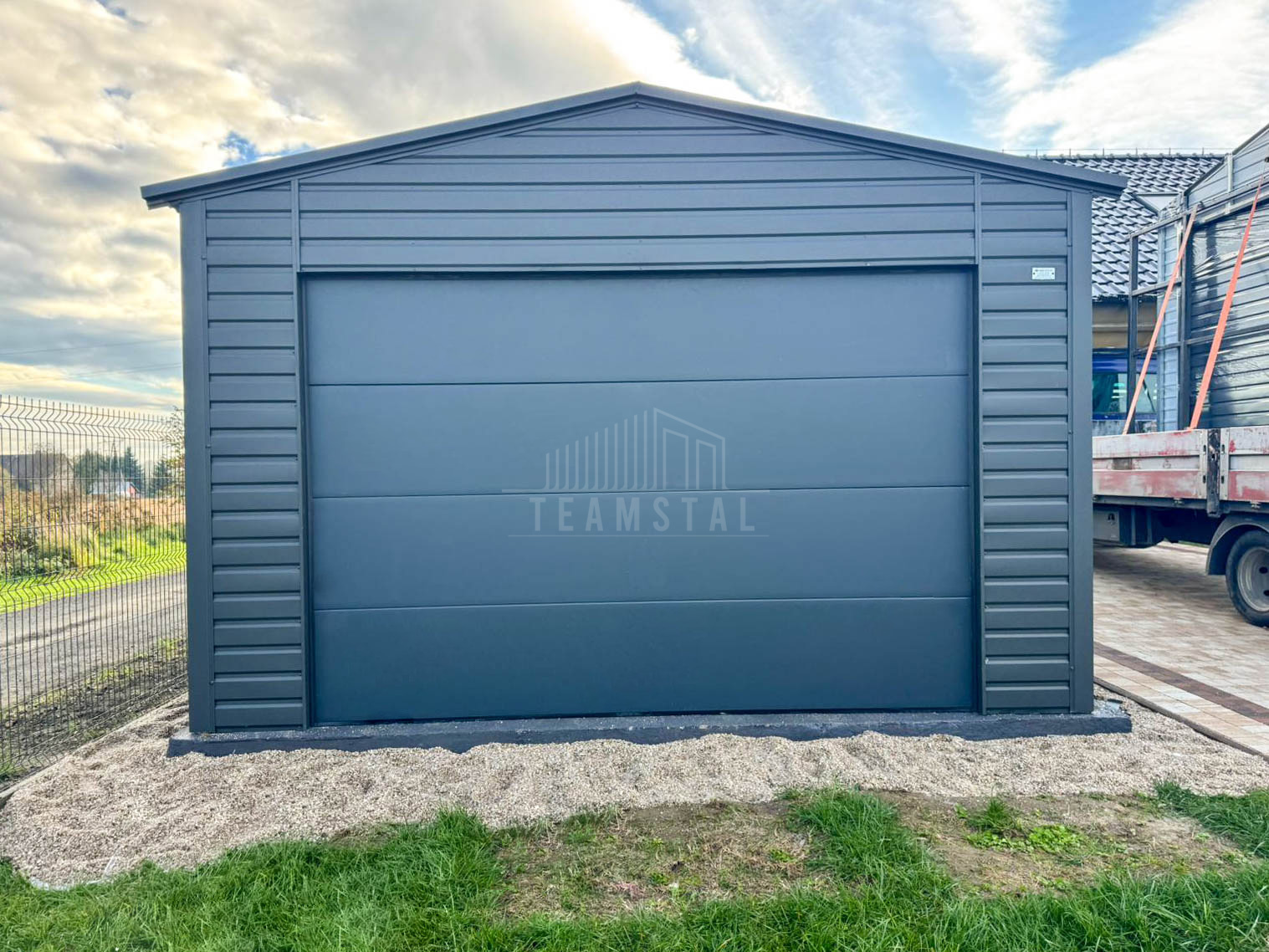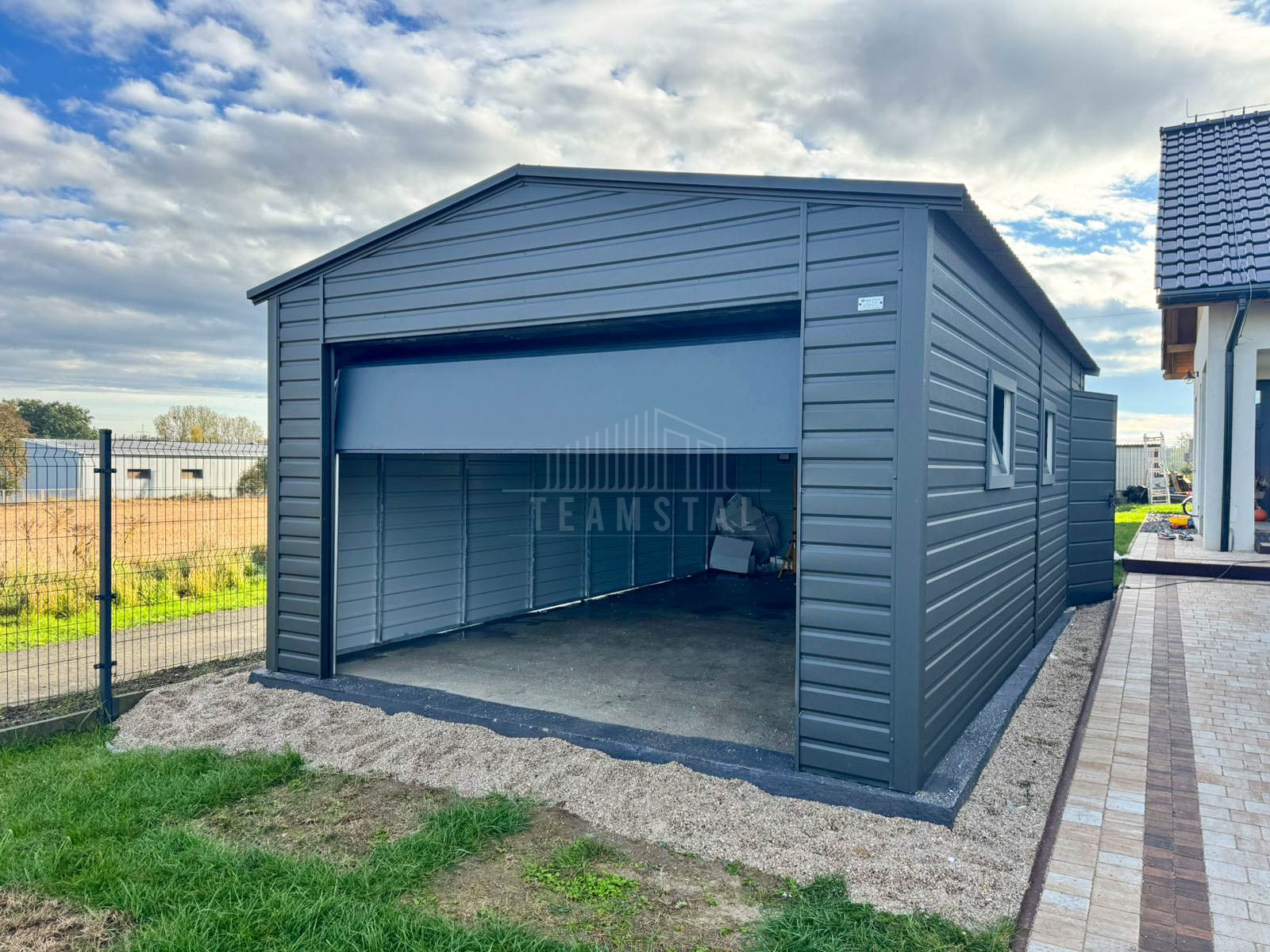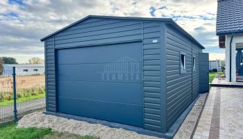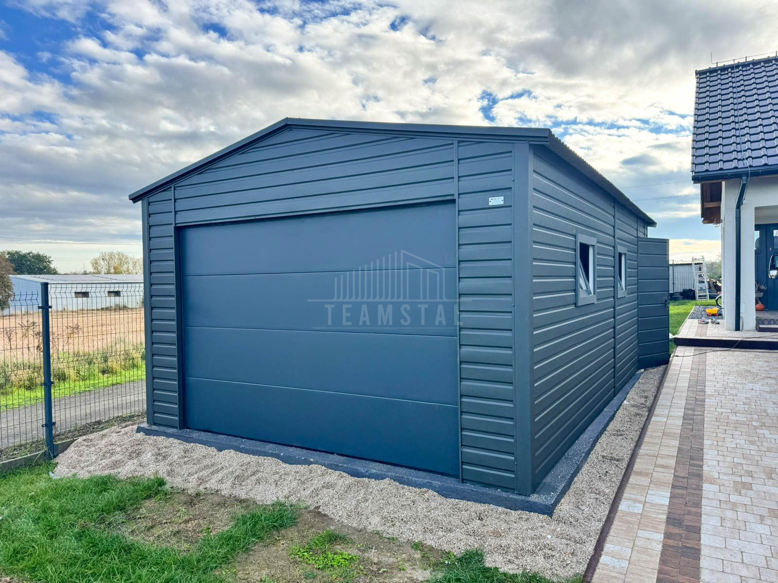 Garaż blaszany 4x6m – brama segmentowa – drzwi – 2 x okno – antracyt – dach duwpadowy TS1192
