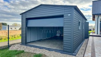 / Garaż blaszany 4x6m – brama segmentowa – drzwi – 2 x okno – antracyt – dach duwpadowy TS1192