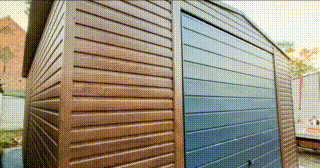 GARAŻ BLASZANY 5m x 7m poziom – dwuspad – Brama uchylna – ciemny orzech – podwyższenie TS236 5×7