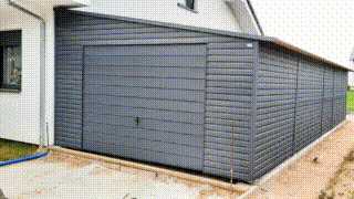GARAŻ BLASZANY 5m x 8m poziom – spad w prawo – Brama uchylna + drzwi – antracyt grafit TS291 5×8