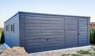 GARAŻ BLASZANY 6m x 5,80m poziom – spad tył – Brama uchylna + drzwi + 2x okno – antracyt grafit TS274