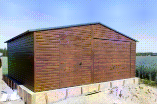 GARAŻ BLASZANY 6m x 5m poziom – dwuspad Brama + drzwi – ciemny orzech TS219 6×5