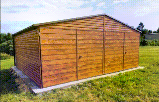 GARAŻ BLASZANY 6m x 5m poziom – dwuspad Brama dwuskrzydłowa – jasny orzech TS220 6×5