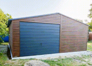 GARAŻ BLASZANY 6m x 6m dwuspad – Brama uchylna – ciemny orzech – dodatkowe drzwi – 2x okno TS244 6×6