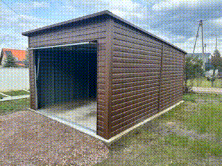 Garaż Blaszany 3,5×6 Brama uchylna Drewnopodobny Ciemny Orzech – dach Spad w tył TS582