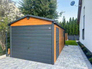 Garaż Blaszany 3x6m – Brama uchylna – Drzwi – Okno – Jasny orzech – Drewnopodobny – Antracyt – Rynny – dach dwuspadowy TS784