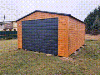 Garaż blaszany 4x5m – brama dwuskrzydłowa – okno – jasny orzech – drewnopodobny – dach dwuspadowy TS1064