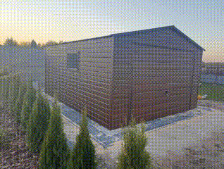 / Garaż blaszany 4x5m – Brama uchylna – drzwi – okno – ciemny orzech – drewnopodobny – dach dwuspadowy TS844