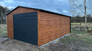 GARAŻ BLASZANY 4×6 m – dwuspad – Brama uchylna – drzw – rynny – jasny orzech – drewnopodobny TS613