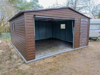 Garaż blaszany 5,5x6m – Brama uchylna – drzwi – Ciemny orzech – drewnopodobny – dach dwuspadowy TS985