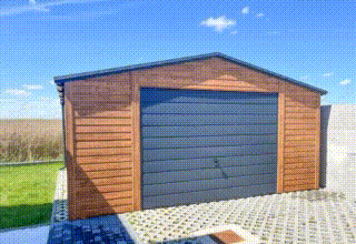 / Garaż blaszany 5x5m – Brama uchylna – drzwi – 2x okno – jasny orzech – drewnopodobny – antracyt – rynny – dach dwuspadowy TS880