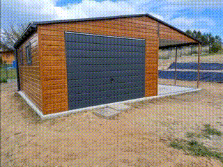 Garaż blaszany 5x6m + wiata 4m Brama uchylna – drzwi – 3x okno – jasny orzech – drewnopodobny – antracyt – rynny – dach dwuspadowy TS845