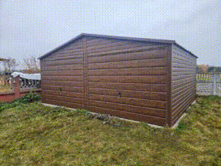 Garaż blaszany 6×5,8m – 2x brama uchylna – blachodachówka – ciemny orzech – drewnopodobny – dach dwuspadowy TS873