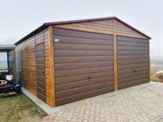 / Garaż Blaszany 6×6 2x Brama uchylna – jasny orzech drewnopodobny – drzwi – 2x okno – dach dwuspadowy TS584