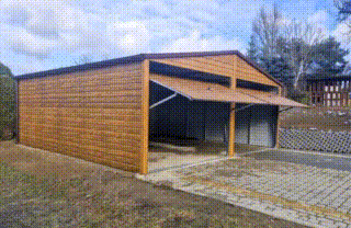 Garaż blaszany 6×6,5m – bramy uchylne – jasny orzech – drewnopodobny – rynny – dach dwuspadowy TS932