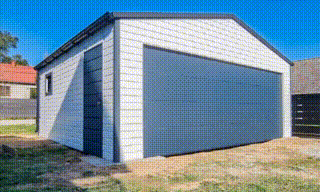 Garaż blaszany 6x6m – Brama segmentowa – drzwi – okno – rynny – biały – dach dwuspadowy TS754