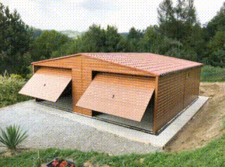 Garaż blaszany 7,5x6m – 2x brama uchylna – złoty dąb – drewnopodobny – blachodachówka – rynny – dach dwuspadowy TS881