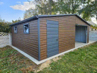 Garaż blaszany 7,5x6m – Brama uchylna – drzwi – 2x okno – ciemny orzech – drewnopodobny – blachodachówka – rynny – dach dwuspadowy TS874