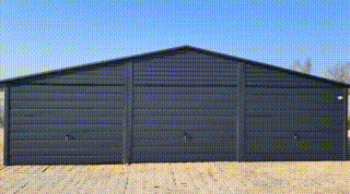 / Garaż blaszany 9x6m – 3x Brama uchylna – okno – antracyt – rynny – dach dwuspadowy TS1055