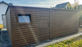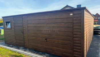 Garz blaszany 5,5x6m – brama uchylna – drzwi – okno – ciemny orzech – drewnopodobny – spad dachu w tył TS1197