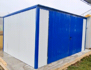 GARAŻ BLASZANY 4m x 5m pion – spad w tył – Brama – niebieski + biały TS283 4×5