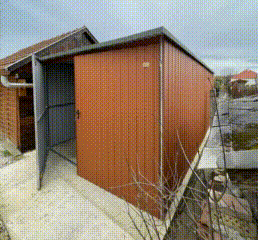 Garaż blaszany 3x6m – Brama dwuskrzydłowa – jasny brąz ( ceglasty ) – dach spad w tył TS1008