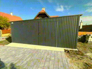 / Garaż blaszany – Schowek 6x3m – Brama dwuskrzydłowa – antracyt – rynny – dach spad w bok TS852